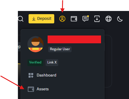 두 번째 방법: 프로필을 통한 접근 화면 상단 우측의 프로필 아이콘을 클릭한 후 'Assets'를 선택하세요. 그러면 자산 관리 페이지로 이동할 수 있어요. 이후 Deposit 버튼을 클릭하세요.