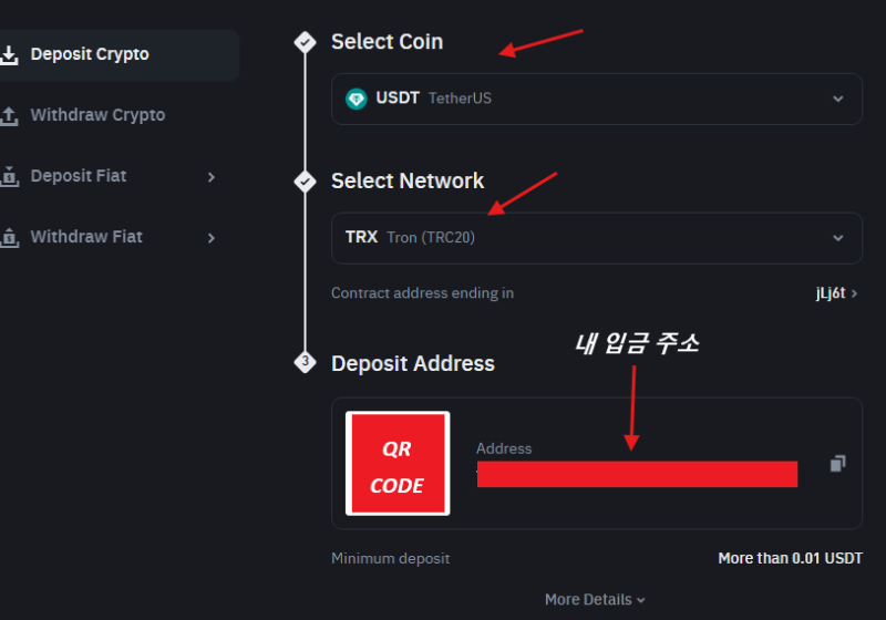 암호화폐와 네트워크를 선택하세요. 출금 방법 가이드를 읽으셨다면 어떤 코인을 선택해야하는지 아실거에요. 보통 네트워크 수수료가 저렴한 USDT(TRC 20), TRX 코인을 주로 사용합니다.
