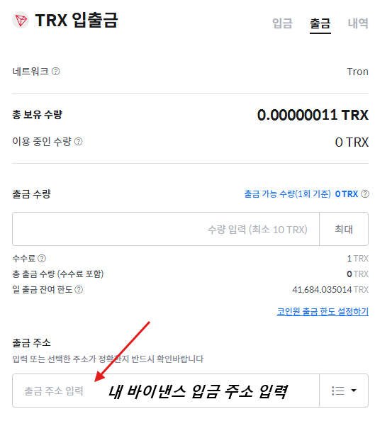 화면에 표시되는 내 입금 주소로 국내 거래소에서 출금하면 됩니다.
